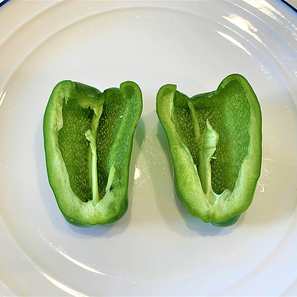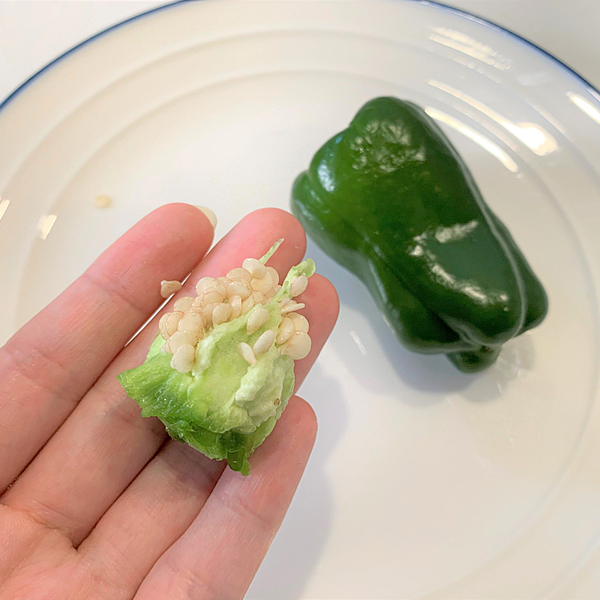 あとはピーマンの頭の方を下に向けて軽く振ると、中に残った種がパラパラと出てきますよ。