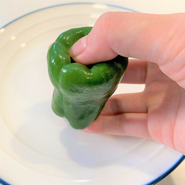 まずはピーマンのヘタの部分に親指をあて、下に向かって押し込みます。