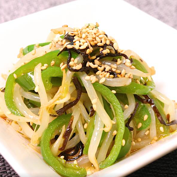 ピーマンの下処理方法とあわせて、ここからはピーマンを使った副菜レシピをご紹介します。今回は、たった10分で作れる「ピーマンともやしの塩昆布ナムル」をピックアップしました。電子レンジで作れるお手軽レシピなので、ぜひチェックしてみてくださいね。