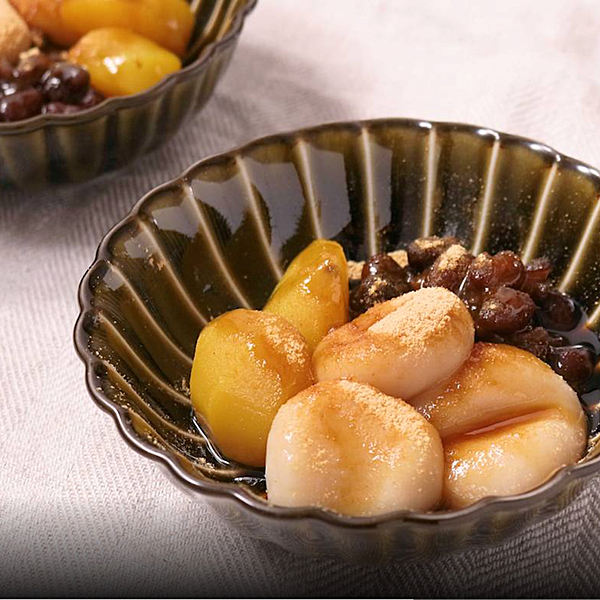 4.お皿につぶあん、3、栗の甘露煮を盛り付け、きな粉、黒蜜をかけたら完成です。