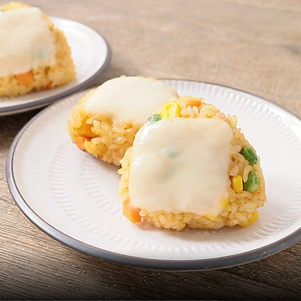具だくさんがうれしい!チーズカレー焼きおにぎりはいかがですか?ミックスベジタブルとごはんに調味料を合わせて握り、チーズをのせて加熱しました。カレー粉やケチャップを合わせたほんのりスパイシーなカレー味に、チーズのコクが相性抜群!こんがり焼くことでカリッとした食感に仕上がり、パクパク食べられますよ。スライスチーズはピザ用チーズで代用してもお作りいただけますので、ぜひ挑戦してみてくださいね。