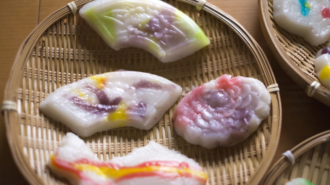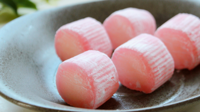 すあまとは、上新粉で作る餅菓子のこと。ピンク色に着色され、一見するとかまぼこのような見た目をしています。作り方は、お店や作り手によって異なるようですが、お湯を加えた上新粉を蒸して砂糖を混ぜ、杵でつき、練り上げて作られます。
