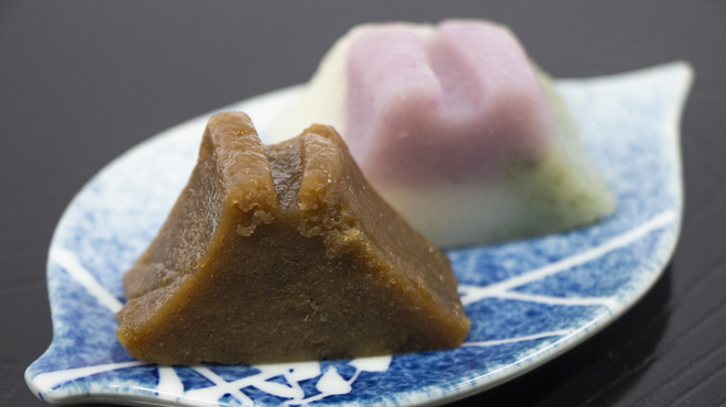 からすみと聞くと珍味をイメージする方が多いかと思いますが、ここでいうからすみは、上新粉と砂糖を練って木の型に入れて蒸したお菓子です。切ると断面が富士山のような形になり「子どもが日本一になれますように」という願いが込められています。