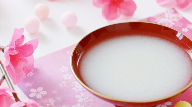一つは、上巳(じょうし)の節句とともに中国から伝わってきた「桃花酒(とうかしゅ)」がもとになっているというもの。もともとは桃の花を酒に浮かべたこの桃花酒を飲んでいたそうですが、江戸時代になるとこれが白酒に変わりました。お腹に大蛇を宿した女性が3月3日に白酒を飲んで、大蛇を追い出したという逸話があり、「厄除け」の意味も込めて女の子に白酒を飲ませるようになったのだそうです。