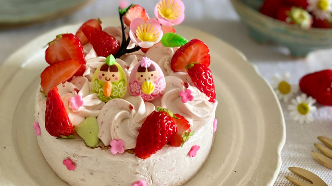 子どもがよろこぶ「ケーキ」を用意するご家庭も多いですよね。ケーキは洋風でも、生地に緑色やピンクの着色をして菱餅風にしたり、桃の花やひな人形の飾りをするなど、ひな祭り風のデコレーションを楽しむことができますよ。