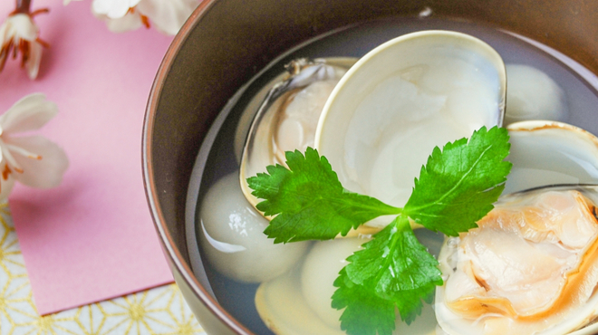 ハマグリの旨味たっぷりのお吸い物はいかがでしょうか。解説にもありましたが、ハマグリは良縁を願う縁起物としてお祝いの席には欠かせない食材です。さらに「縁結び」という意味もある結び三つ葉を添えれば、より縁起のよい一品に!ぜひ三つ葉を結んで添えてみてくださいね。