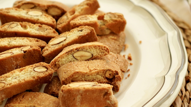 ナッツを加えた生地をバゲットのような形に伸ばして焼いたあと、スライスしてからもう一度焼いてカリッと香ばしく仕上げます。本場イタリアでは、エスプレッソや甘口ワインに浸していただくのが一般的です。