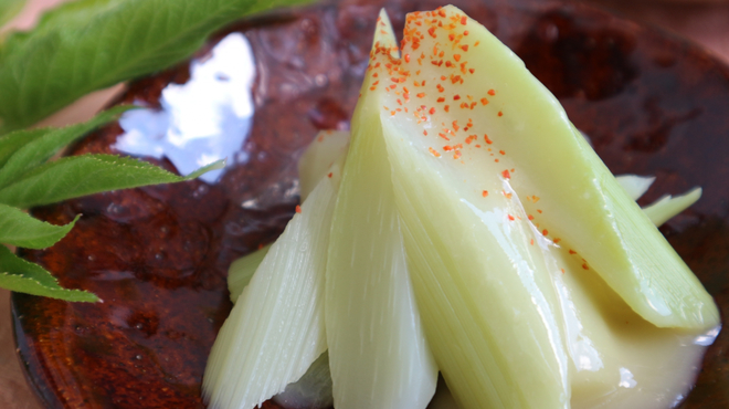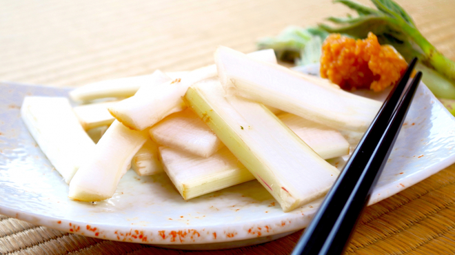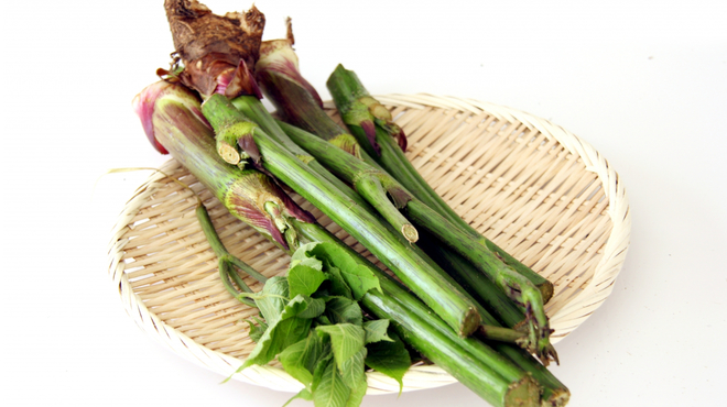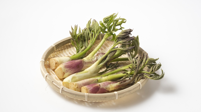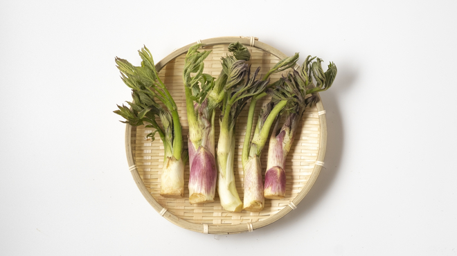 山ウドは本来、山や河川敷などで自生している、自然に育った野生のものを指します。そのため、天然山ウドと呼ばれることも。葉先から茎まで緑色で、アクが強くえぐみがあります。