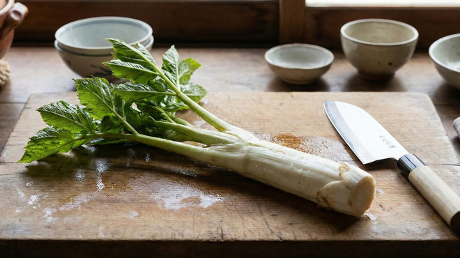 新鮮なウドの茎は、薄くスライスして生で食べるのがおすすめです。シャキシャキとした食感と特有の風味を存分に楽しめます。