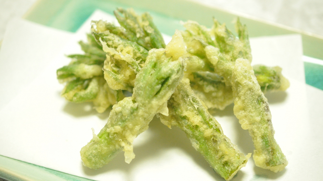 穂先は、天ぷらなどの揚げ物にするのがおすすめ。風味豊かなウドの天ぷらは春を感じさせる味わいです。