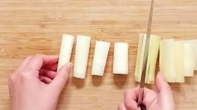 節の部分で切り分けたら、繊維のかたい皮をやや厚めにむきます。