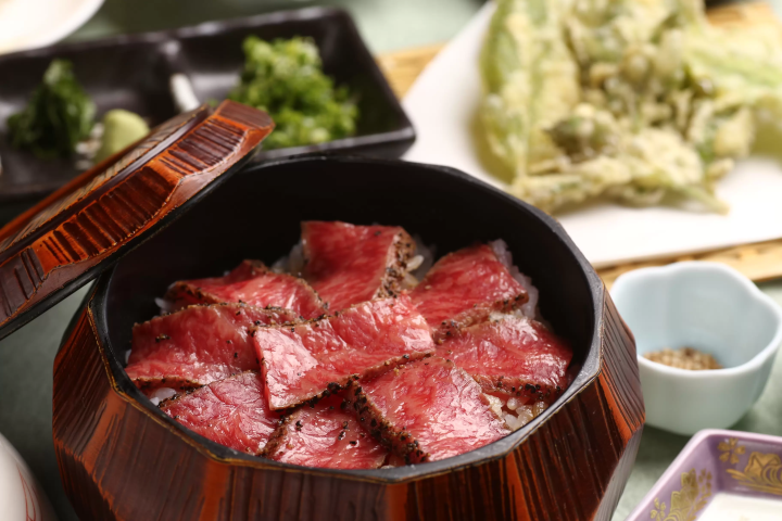下呂温泉の老舗旅館「水明館」の中のお食事どころ「北乃寮」では、ランチタイム限定の「飛騨牛ひつまぶし膳」が人気です。甘辛い特製のタレとあっさり仕上げた飛騨牛が相性抜群です。口に拡がる芳醇な飛騨牛の香りをご堪能下さい。ランチ利用の方は日帰り入浴もお得になるので是非合わせてお楽しみくださいませ。