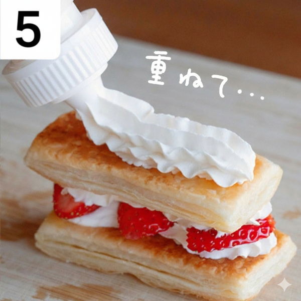 5.3の1枚にホイップクリーム、4を3枚、ホイップクリームの順に重ねます。同様にもう1段重ね、3を1枚のせます。