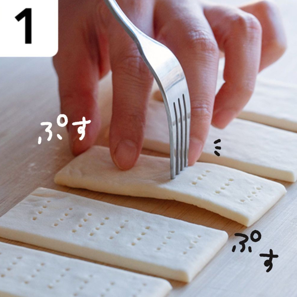 1.冷凍パイシートは6等分に切り、フォークで数ヶ所に穴をあけ、グラニュー糖を両面にふりかけます。