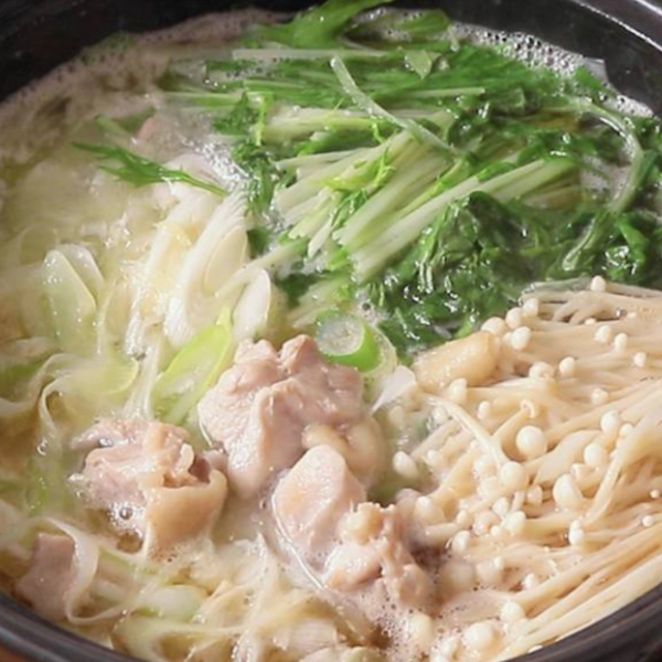 4.土鍋にスープの材料、3を入れて中火で加熱し、沸騰してきたら弱火にして鶏もも肉に火が通るまで5分程煮ます。