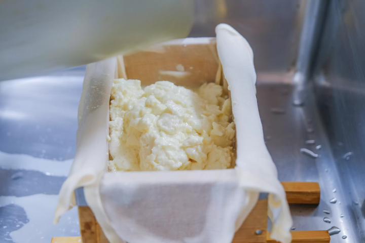 お豆腐が固まったら、専用の型に入れて成形します。この時、自然に固まったものが「絹ごし豆腐」、布に包んで水分を抜いたものが「木綿豆腐」と呼ばれています。