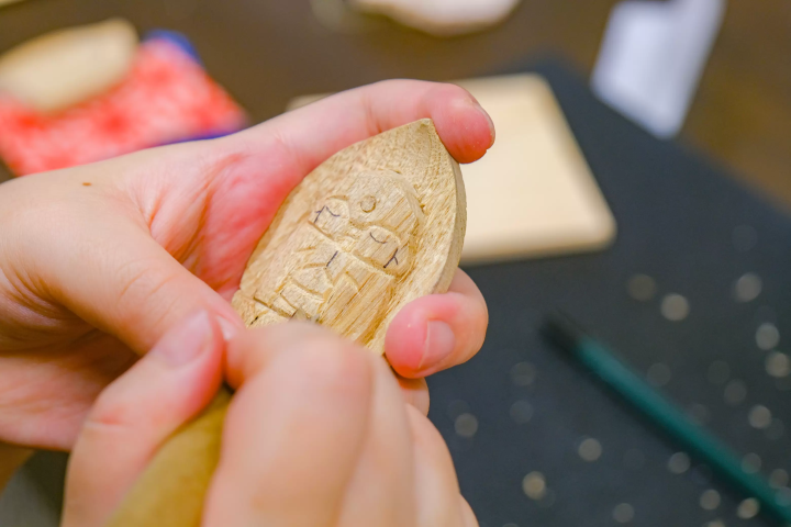 作業時間はおよそ2時間。香りの良い楠の木を左手に、右手に彫刻刀を持ち、じっくりと自分だけの旅のお守り作りに思いを馳せていきます。