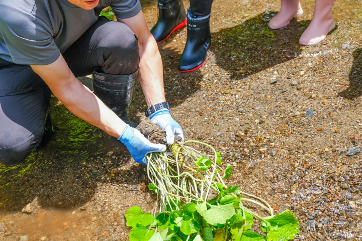 畳石式わさび田の美しい景観を眺めつつ、自分の手でわさびを収穫。すぐにすりおろして食べるわさびは、市販のペーストタイプのわさびとはまったくの別物です。