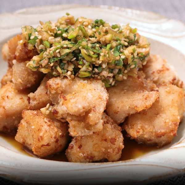 サクサクの衣がクセになる、揚げ鶏の香味ポン酢を作ってみましょう!片栗粉をまぶして香ばしく揚げた鶏むね肉に、香味ポン酢ダレをたっぷりかけていただく一品。ジューシーな揚げ鶏にほどよく酸味の効いた香味ポン酢ダレが合い、箸が止まらないおいしさです。長ねぎやミョウガのシャキシャキとした食感もGOOD!大葉のさわやかさもあいまって、さっぱり食べられますよ。