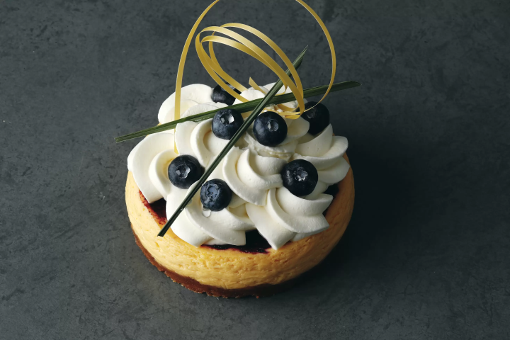 3種のチーズを使ってじっくり丁寧に焼き上げた、濃厚でなめらかなチーズケーキ。表面に飾られたブルーベリーがほどよい酸味を添え、食後のデザートにも最適です。