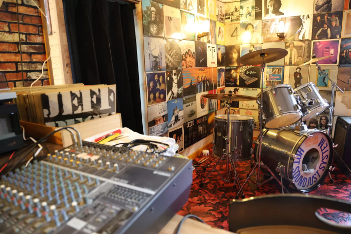 カフェメニューの一つ一つが、素材からデザイン、ネーミングまでこだわり満載のカフェですが、ご主人の「男の浪漫ルーム」も見せてもらいました。カフェの隣にあり、まるで秘密の隠れ家やバーに見えますが、ドラムや音響装置が本格的で、壁のレコードは貴重なコレクションばかりです。
