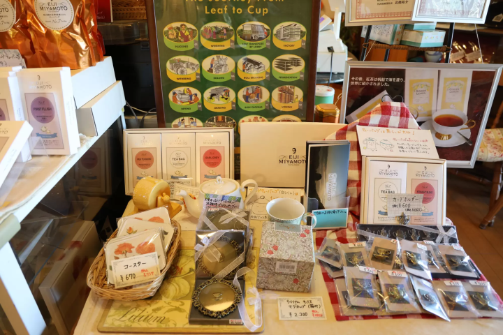 カフェでは「ⓇEIJIMIYAMOTO」のブランド紅茶を購入することもできます。お庭で味わって美味しかったので、いろいろ買って帰り、自宅で楽しんでいます。自然の香りとともに、本当に美味しくて飲みやすい紅茶です。