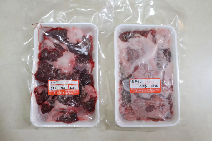 お店では肉の加工も行っており、大きな冷蔵庫には持ち帰り用の千屋牛もあります。お土産や自宅用におすすめです。カレーや煮物用の千屋牛のすじ肉を購入して使ってみましたが、スーパーマーケットで買うものとは品質が違い、とても美味しかったです。お持ち帰り用の保冷バッグに保冷剤を入れてくれるので安心です。