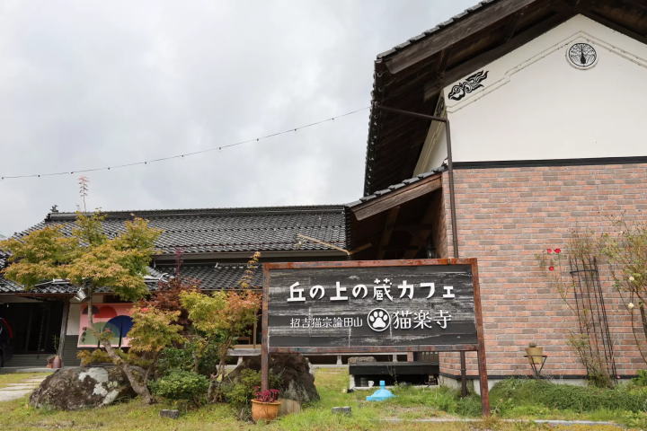 「和牛レストランふゆさと」の近く、同じく国道180号線沿いの丘の上にある「丘の上の蔵カフェ(猫楽寺)」は、金曜日・土曜日のみ営業している古民家(伝統的な日本家屋)カフェです。ランチは予約制(3日前までに要予約)、カフェ利用は予約なしでも大丈夫です。今回は、カフェとして訪問しました。「(猫楽寺)」という名前の通り、2匹のかわいい看板猫がいるカフェで、猫好きの方には特におすすめのお店です。