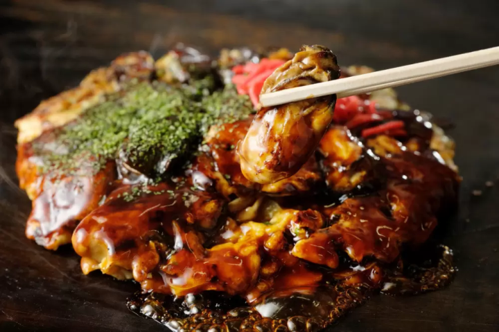 「日生カキオコ(牡蠣入りお好み焼き)」は、香ばしい生地にたっぷりの牡蠣が入った冬限定のご当地グルメで、デートの食べ歩きにもぴったり。