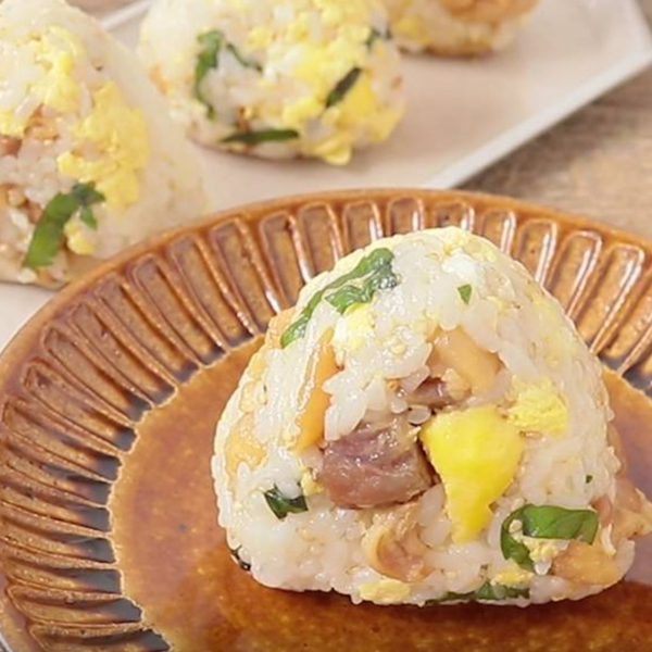 ボリューミーな、ごろごろごちそうおにぎりをご紹介します。旨味たっぷりなタレ味の焼き鳥の缶詰とふわふわの卵は、白いごはんと相性抜群。刻んだ大葉をごはんと一緒に混ぜ込むことで爽やかな風味がプラスされ、甘じょっぱいタレとも相性がいいですよ。卵は電子レンジで加熱するので時短になります。忙しい朝にもおすすめですよ!