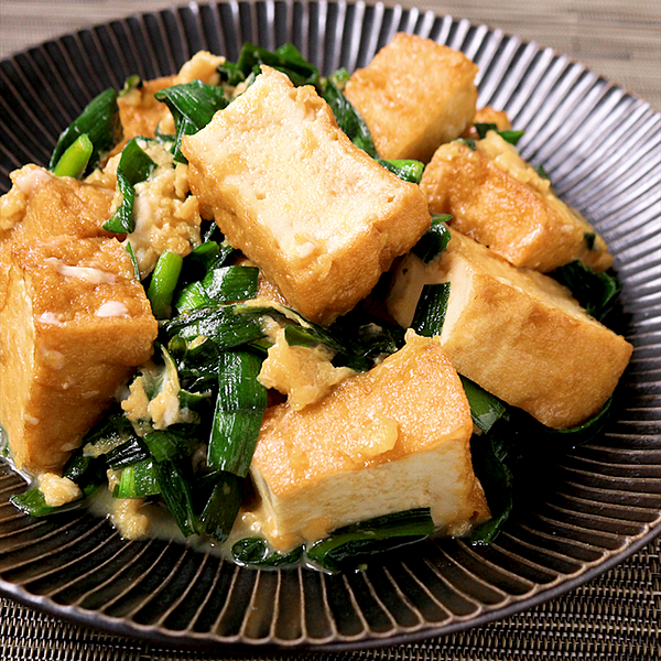 食べ応えのある、厚揚げ入りのニラ玉はいかがでしょうか。風味のよいごま油で炒めた厚揚げとニラに、やさしい味わいの溶き卵がマッチした一品。しょうゆやみりんなどの甘辛い味つけとニラの香りを吸った厚揚げは、やみつきになるおいしさです。しっかりとした味つけで、ごはんもお酒も進みますよ。